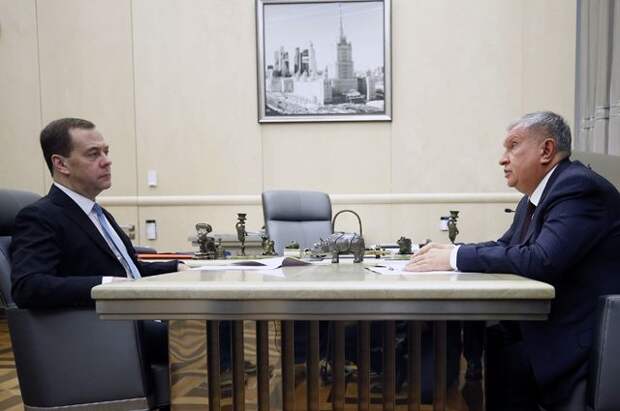 Председатель Правительства России Дмитрий Медведев и Главный исполнительный директор ПАО «НК «Роснефть» Игорь Сечин провели деловую встречу.