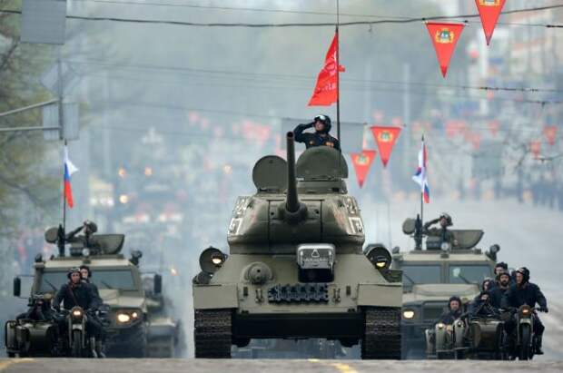 По традиции парад механизированных колонн откроет советский средний танк Т-34 с копией Знамени Победы, рассказал он.