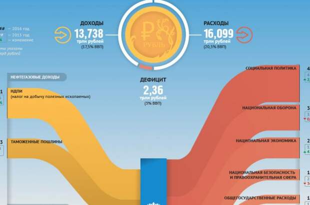 Дефицит бюджета — 2, 360 трлн рублей (3% ВВП). Его собираются покрыть в основном за счёт средств Резервного фонда (5 трлн 507 млрд рублей), сокращения расходов профильных министерств и заморозки накопительной части пенсии.К кризису привыкли. Эксперты дают экономические прогнозы на 2016 год