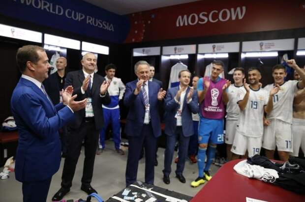 Премьер-министр России Дмитрий Медведев лично поздравил футболистов сборной России по футболу с победой над командой Испании в матче 1/8 финала чемпионата мира. После игры глава кабинета министров зашел в раздевалку национальной сборной.