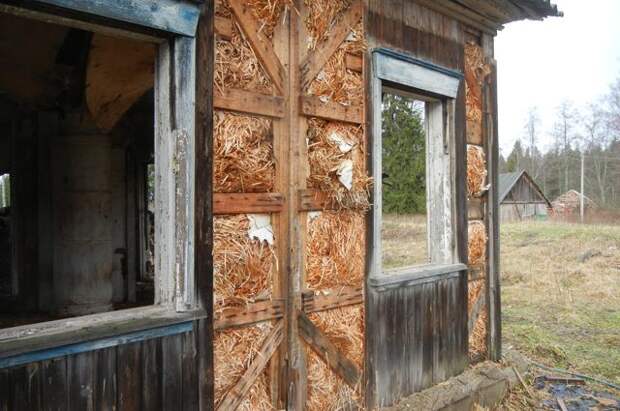 Сено, солома, тростник, мох, опилки или стружки – ещё одна категория проверенных временем природных утеплителей. Мхом утепляли (и продолжают до сих пор) межвенцовые швы в деревянных срубах. Из тростника и соломы устраивали кровли домов, причём их толщина могла доходить до 1,5–2 м (у конька). Сеном в деревнях зимой устилали пол и потолок, а на окна снаружи вешали толстые плетёные маты из соломы. Первые послевоенные щитовые дома утеплялись стружкой.