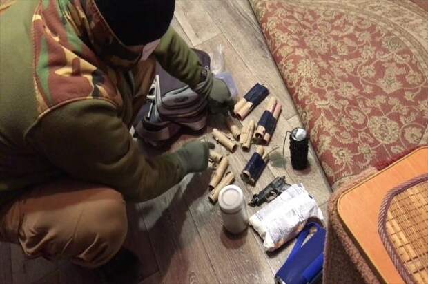 На кадрах видно, как сотрудники службы заходят в дома. При этом задержанные сопротивления не оказывают. Затем человек в гражданской одежде достает из рюкзака самодельные взрывные устройства и их элементы.
