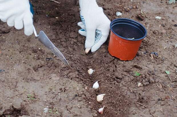 Отделяю их незадолго перед посадкой и 20 минут протравливаю раствором Максима (можно взять Максим дачник, Фитоспорин или Бактофит). Измеряю высоту зубчиков, умножаю эту величину на 3, прибавляю еще 5 мм – получится нужная глубина бороздок. Интервалы между ними – 25 см. Дно присыпаю песком. Втыкаю чеснок через каждые 10 см, засыпаю почвой и мульчирую перепревшим компостом.С. Тонких, Дубна