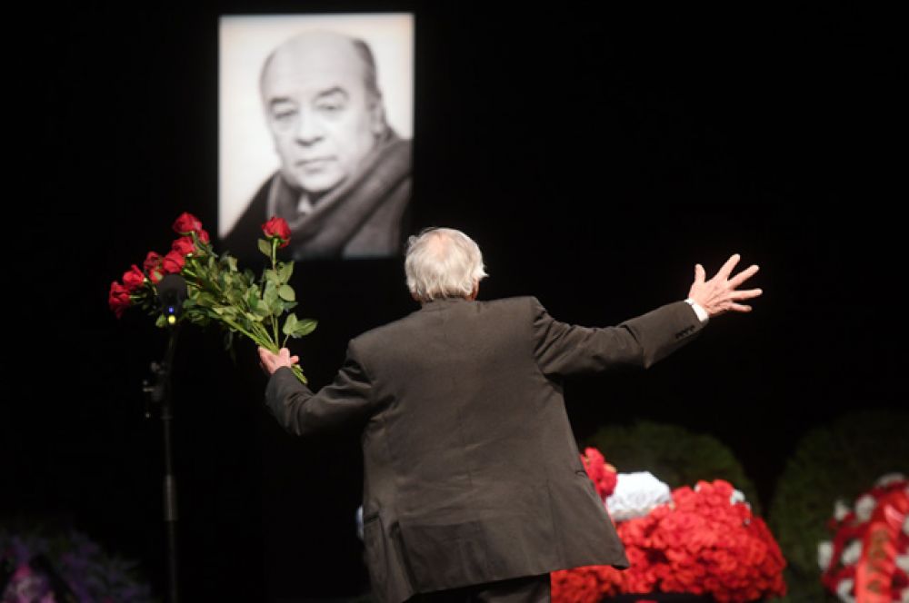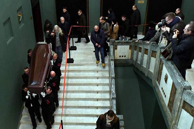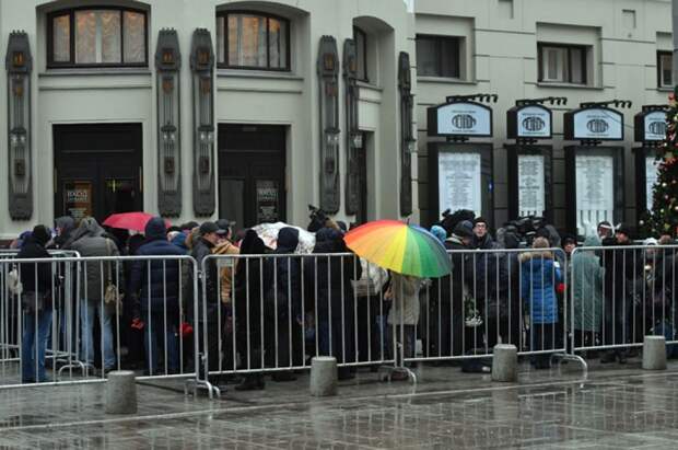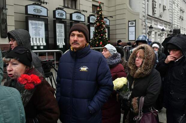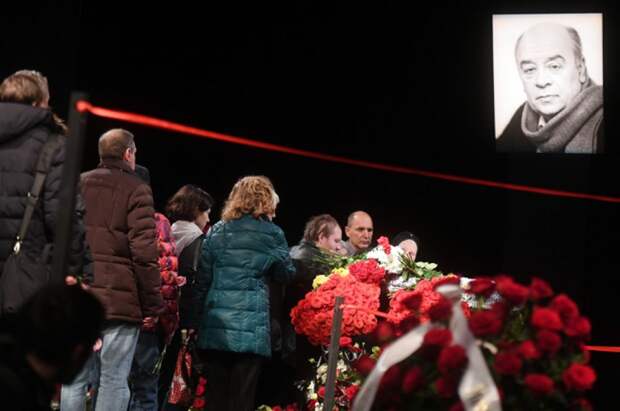 В театре «Ленком» в Москве проходит прощание с народным артистом, актером театра и кино Леонидом Броневым. У входа в театр стоят люди с цветами, которые пришли попрощаться со знаменитым актером. После окончания гражданской панихиды Леонида Броневого похоронят на Новодевичьем кладбище.