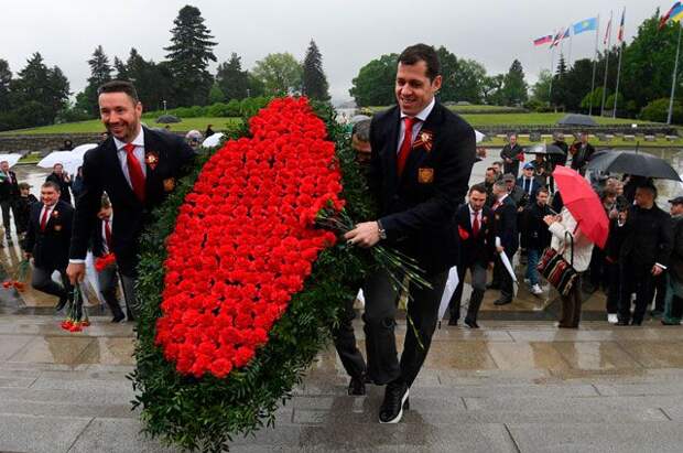Российские хоккеисты в День Победы по традиции возлагают цветы к мемориалам, которые посвящены солдатам, погибшим в Великой Отечественной войне.