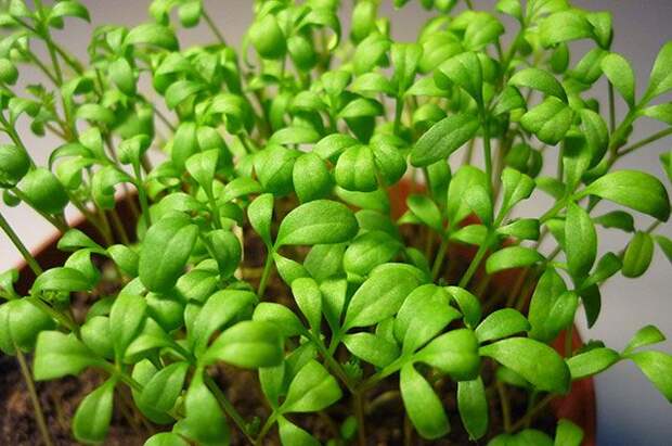 Совсем другое дело — овощи-спринтеры, которые пробегают свою растительную дистанцию за считаные дни. Наиболее известный скоростной овощ — это кресс-салат. Ему для роста даже земля не нужна — семена просто рассыпают по влажной вате. Рассыпают густо, как кокосовую стружку на пончик. Уже на следующий день начнут разворачиваться семядоли. Ещё через несколько дней появятся первые настоящие листочки. Это значит, что наступило время уборки урожая. Свежая зелень кресс-салата по вкусу напоминает листовую горчицу. Если вы поливали растения кипячёной водой, то и мыть их не нужно — стригите ароматные листочки в тарелку.