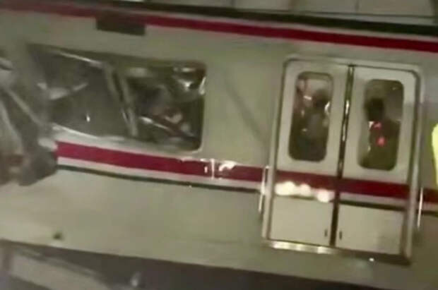 На кадрах запечатлен поезд, который получил повреждения в результате столкновения. Около него стоят люди, некоторые из них снимают происходящее на телефон.