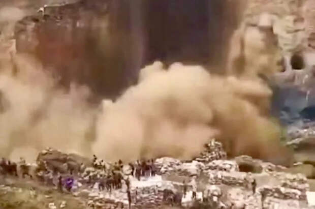 На кадрах видно, как горная порода начинает обваливаться. В результате возникают клубы пыли. Они накрывают находившихся рядом людей.
