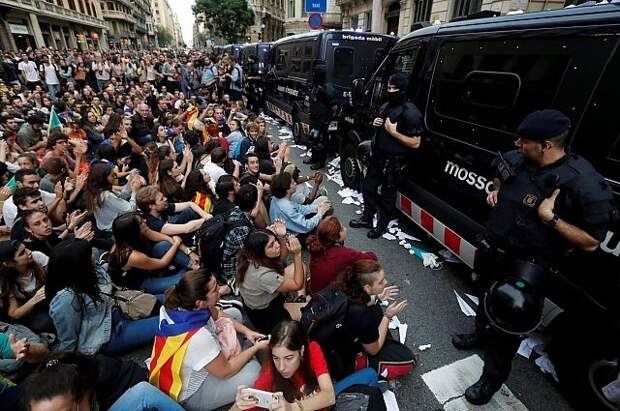 Как сообщает ТАСС, молодые люди сели напротив входа в штаб нацполиции Испании. Из-за этого оказалась заблокирована улица Лаетана в центре Барселоны. Стражи порядка выставили вдоль входа в здание штаба цепочку полицейских фургонов.