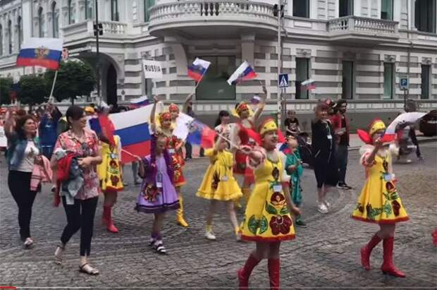 На торжественное шествие участники фольклорного фестиваля выходят в своих национальных костюмах. Россияне поступили аналогичным образом, а также развернули национальный флаг. Как утверждают свидетели, юные ростовчане скандировали «Россия, Россия!»