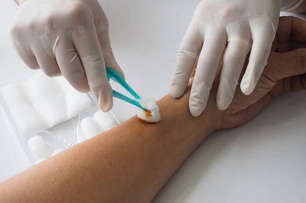 Спиртовые растворы антисептиков (йод, зелёнка) не следует лить непосредственно в рану. Они вызывают неприятные ощущения и могут оказывать повреждающее действие, замедляя заживление. Промывать раны можно бетадином, мирамистином, перекисью водорода или хлоргексидином.