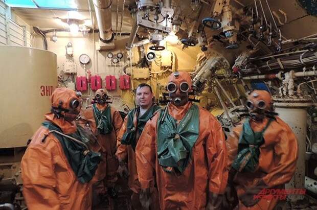 Комплекс борьбы за живучесть — здоровенный железный ящик длиной метров 10 и высотой метра три. Он забит непонятными для непосвященного трубами, вентилями, механизмами. Внутрь запускают 5 человек в оранжевых СГП — спасательных гидрокомбинезонах подводника — и задраивают люки.