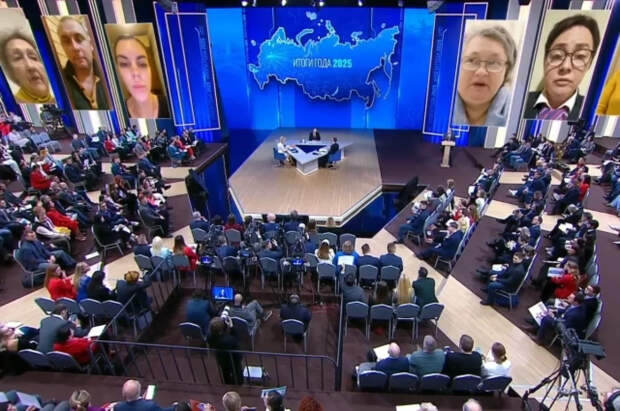 Прямая линия совмещена с пресс-конференцией, в рамках которой Владимир Путин подводит итоги 2025 года и отвечает на наиболее значимые вопросы граждан и представителей СМИ. Мероприятие проходит в Гостином Дворе в Москве.