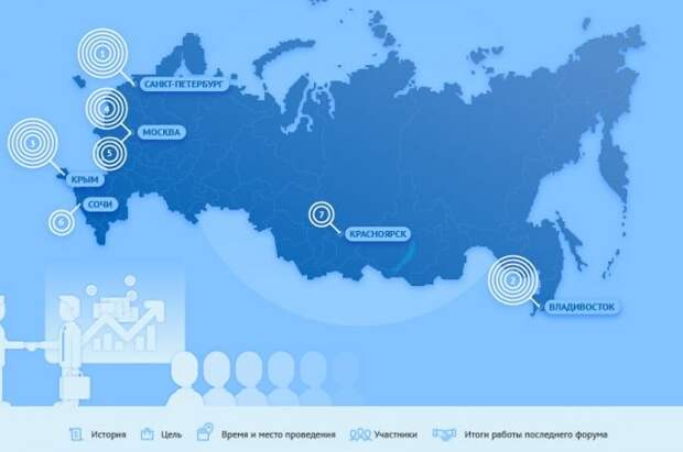 Так, появились Красноярский экономический форум, Восточный экономический форум во Владивостоке, Гайдаровский форум в Москве, Неделя российского бизнеса, форум в Ялте.Смотрите в инфографике АиФ.ru, какие форумы в России выделяются и почему.