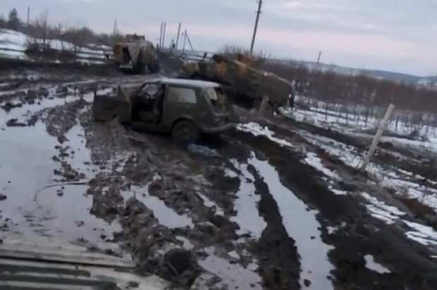 Слева и справа на дороге стоят около 10 единиц уничтоженной и увязшей в грязи техники, среди них как минимум 4 турецких MRAP.