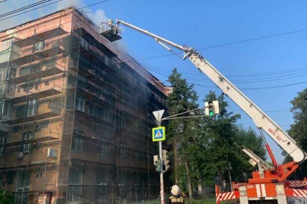 «Для ликвидации возгорания на кровле здания используется высотная техника.