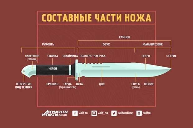 Обычный же человек в большинстве случаев различает лишь лезвие и рукоять. Какие еще у ножа есть составные части, смотрите в тематической иллюстрации АиФ.ru.Смотрите также: Перочинный нож. Инфографика