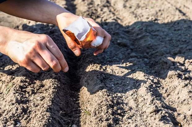 Лучше всего сеять, как говорят, «по черепку» – это означает, что почва уже замёрзла, но днём слегка оттаивает сверху. Грядка должна быть подготовлена заранее, а сухая почва для засыпки борозд и торф для мульчирования – лежать наготове под навесом. Бороздки делают на 2 см глубже (почва осядет), а сухие семена без замачивания сеют примерно в 1,5 раза гуще по сравнению с весенним посевом. Бороздки засыпают землёй, а сверху мульчируют торфом или листовым компостом (чтобы воспрепятствовать образованию корки).