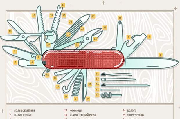 За то, что современные перочинные ножи стали настоящей палочкой-выручалочкой, следует благодарить швейцарцев. Именно этот народ внес наибольший вклад в их многофункциональность, для него это вопрос не только национальной гордости, но и национальной безопасности. Ведь каждый солдат альпийской республики имеет личный складной нож, чья начинка может различаться в зависимости от рода войск. Но неизменным остается высочайшее мастерство исполнения. На швейцарский нож выдается пожизненная гарантия качества, так что его обладатели в любой ситуации могут всегда рассчитывать на складного «помощника».