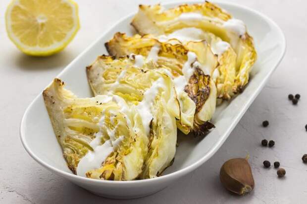 Стейк из молодой капусты с гребешком