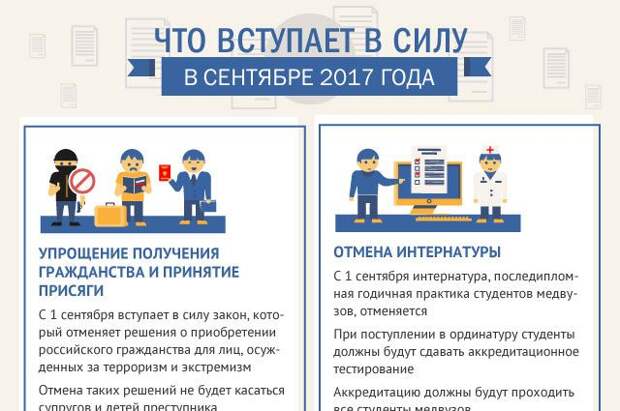 С сентября 2017 года вступают в силу законы и постановления, касающиеся принятия гражданства России, отмены интернатуры, возмещения убытков по ОСАГО и новых правил пожарной безопасности.
