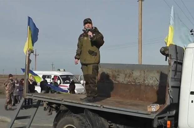 Мужчина, стоящий в кузове грузовика, используемого в качестве трибуны, кричит: «Российские оккупанты со стороны Крыма собирают десятитысячное войско и технику, ожидая только команды осуществить наступление на материковую часть Украины».