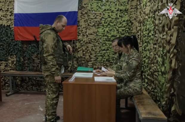 Ведомство также показало видео голосования российских бойцов. В нем военнослужащие по очереди заполняют бланки под наблюдением участковой избирательной комиссии.