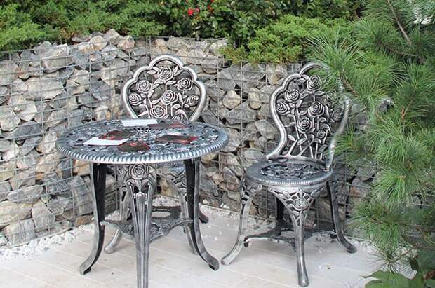 Любителям позавтракать или просто выпить чашечку ароматного чая на открытом воздухе не обойтись без столика. Если вы озабочены приватностью своего времяпрепровождения, лучше надёжно спрятать его от посторонних глаз. Роль стенок в садовой комнате могут сыграть габионы — модные нынче конструкции, представляющие собой проволочную сетку, заполненную камнями, разноцветным стеклом или другими аналогичными материалами.
