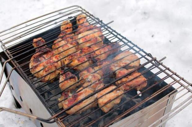 В минусовую погоду угли дольше разгораются, и мясо медленнее готовится. В принципе, шашлыки можно приготовить при любой минусовой температуре, вопрос только в вашей выносливости. Мне довелось жарить при -27. И результат не понравился. Несмотря на хороший жар в мангале и достаточное количество дров, мороз «давил» на мясо, увеличивая время и уменьшая температуру приготовления. Не удалось быстро получить корочку на мясе, и поэтому мясо вышло суховатое.
