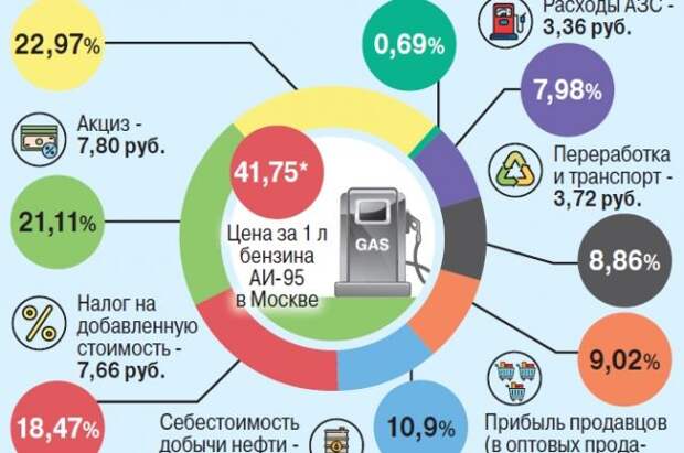 «На самом деле на цены на АЗС влияет не курс валюты, а акцизы, - отвечает исполнительный директор Российского топливного союза Григорий Сергиенко. - В 2016 г. прибавили 2 руб., с 1 января 2018 г. - ещё 50 коп., с 1 июля прибавят столько же. При этом бензин у нас один из самых дешёвых в Европе. В Норвегии, которая тоже добывает нефть, литр стоит дороже 100 руб.».