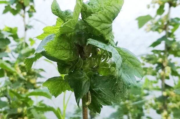 Однако 5 лет подряд в Подмосковье в это время не было холодов.Но тёплая погода вызывает усиленное размножение насекомых, в том числе и вредителей. Обычный, но незваный гость на чёрной смородине – крыжовниковая тля. Заметить её присутствие легко – листья на верхушках побегов сворачиваются в своеобразный кокон, внутри которого вредители устраивают себе «и стол и дом». Сейчас, пока куст цветёт, никаких действий предпринимать не буду – любые обработки повредят не только насекомым-вредителям, но и полезным, которые куст опыляют. А вот как только завяжутся ягоды, удалю этих тлей – разведу на литр воды 3–4 ложки жидкого мыла или натру на тёрке обычное хозяйственное, наполню раствором тазик и приглашу второго садовода в помощь. Помощник будет держать тазик, а я окунать верхушки с коконами в мыльный раствор. В результате тля будет побеждена без всяких ядохимикатов. Для пользы дела в мыльный раствор добавлю жидкое комплексное удобрение, чтобы борьба с вредителем сочеталась с некорневой подкормкой.
