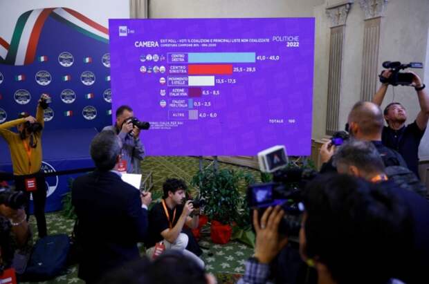 Правоцентристская коалиция лидирует на досрочных выборах в парламент Италии, набирая 41–45% голосов. Об этом говорят первые данные exit poll, продемонстрированные в эфире телеканала Rai News 24.