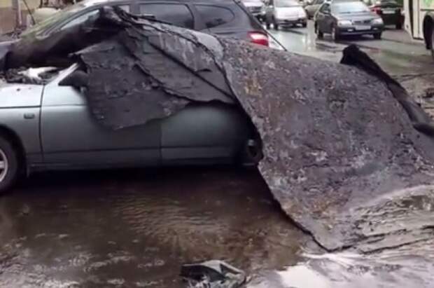 Так, из-за непогоды в районе местной автостанции кровлю здания снесло прямо на проезжую часть, полотно упало на припаркованный автомобиль.