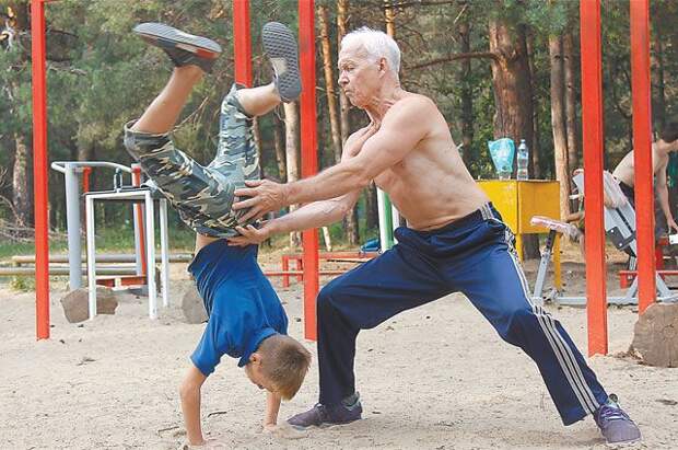 Искал по окрестностям металлолом и сваривал из него спортивные снаряды. Если нужны были деньги, тратил свою пенсию.Прошло три года, и в спортзале под открытым небом теперь есть турники, кольца, канаты, тренажёры, теннисные столы, батут. И ежедневно под руководством дяди Вовы (так его зовут на площадке) совершенно бесплатно занимается спортом до 200 человек!