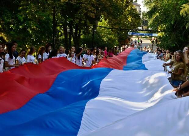 Мероприятие было проведено в честь дня флага РФ. В нем приняли участие порядка 100 местных жителей. Они выстроились в два ряда, удерживая российский триколор.