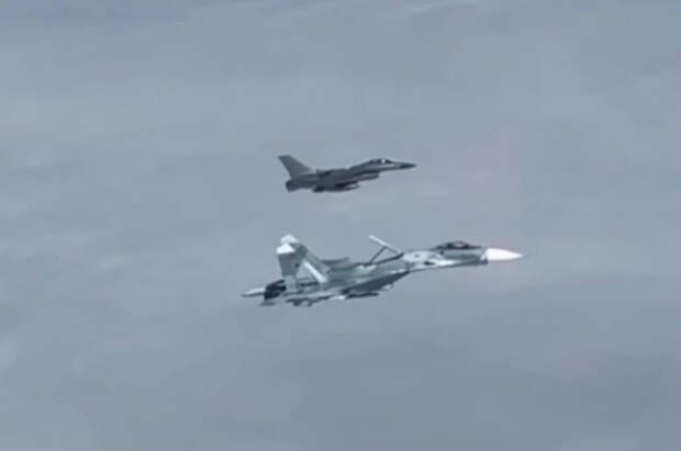Российский летчик-истребитель на Су-27П вынудил изменить курс попытавшегося нарушить воздушную границу РФ над Балтийским морем пилота F-16 ВВС Дании. Кадры, запечатлевшие маневр, опубликовал Telegram-канал FighterBomber.