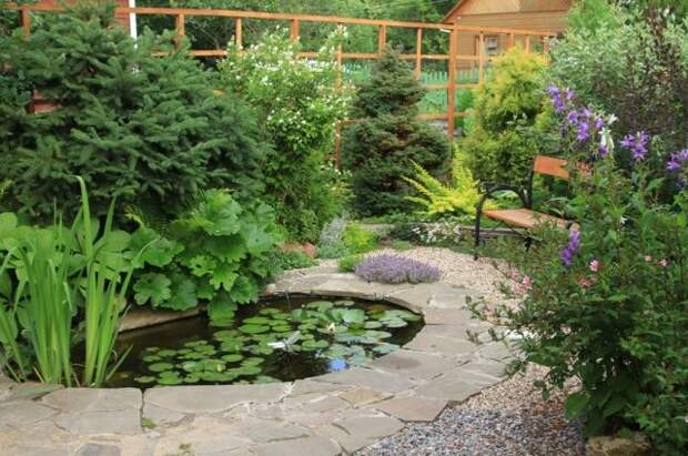 Плитняк надёжно замаскирует края пластиковой формы, но прудик при этом будет выглядеть нарочито искусственно. В некоторых случаях это вполне оправданно, но для тех, кто хочет видеть свой сад более естественным, есть другие решения.По краю пруда можно вразброс уложить несколько крупных камней неправильной формы (известняк, кварцит, диабаз и т. п.), а свободные участки между ними застелить геотекстилем и сделать гравийную отсыпку. После этого рядом с камнями высаживают растения, которые помогут оживить картинку. Очень эффектно и естественно будут выглядеть многолетники с узкой листвой – лилейники, сибирские ирисы, декоративные осоки. Если прудик находится в теневой зоне участка, подойдут папоротники, баданы, пельтифиллум (дармера) с роскошными крупными листьями.