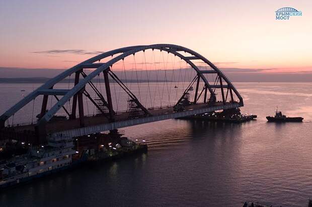 Информационный центр «Крымский мост» сообщил, что строители подняли на проектную высоту 5500-тонную автодорожную арку транспортного перехода через Керченский пролив между Крымом и Краснодарским краем.