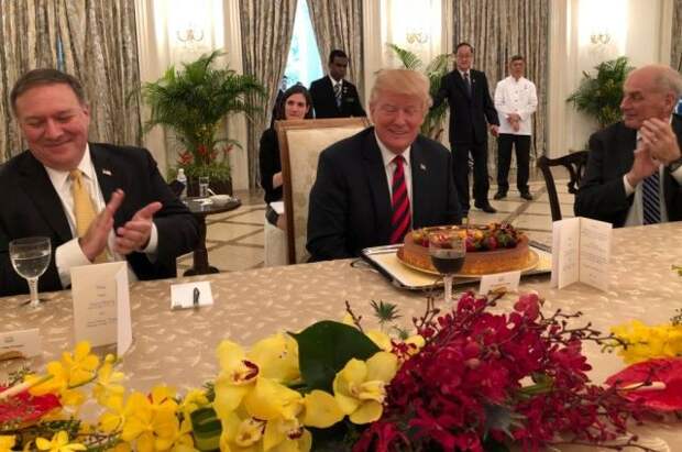 «Празднуем день рождения немного раньше срока», - написал в Facebook министр иностранных дел Сингапура Вивиан Балакришнан под фотографией с обеда, на которой американский президент сидит за столом, а перед ним стоит ягодный торт.