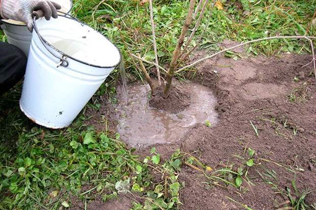 Шаг 4. Обильно поливаем. Не спеша проливаем землю вокруг высаженного растения водой, добавляя её в несколько приёмов, до тех пор, пока она будет способна впитываться. После этого слегка присыпаем поверхность сухой почвой, перепревшим компостом или торфом.