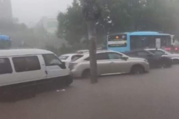 Улицы Владивостока оказались под водой в связи с мощным ливнем. В городе на дорогах образовались пробки, сообщает Telegram-канал «Подъем».