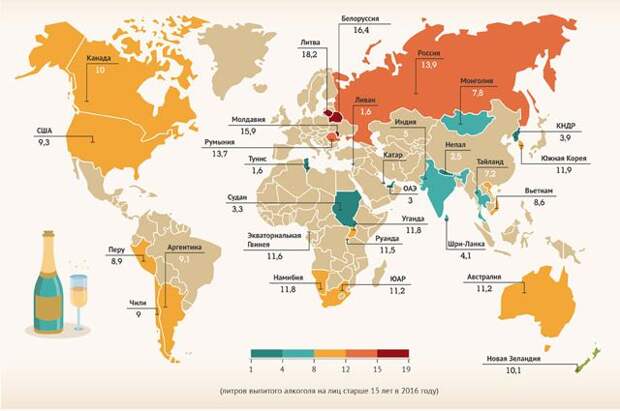 По данным Всемирной организации здравоохранения, самой пьющей страной мира является Литва. Уровень потребления чистого алкоголя в этой прибалтийской республике достигает 18,2 л в год. На втором месте находится Белоруссия, где на каждого жителя страны пришлось около 16,4 л алкоголя. На третьем месте Молдавия с показателем 15,9 л на каждого жителя.