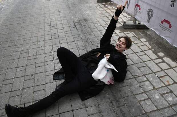 Во время мероприятия в зале поднялся неизвестный молодой человек и заявил, что хочет задать вопрос. Затем он надел маску в виде головы белой лошади и попытался с криками прорваться к Ксении Собчак.