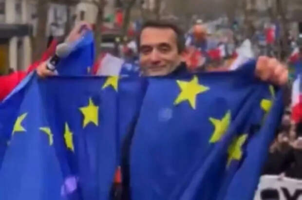 Французский политик, лидер партии «Патриоты» Флориан Филиппо выступил на демонстрации в центре Парижа, во время которой он разорвал два флага Евросоюза.