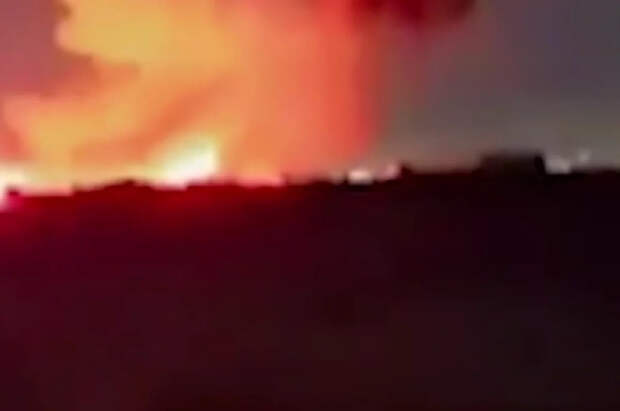 Очевидцы сняли горящий резервуар с топливом издалека, однако на опубликованных кадрах можно заметить мощные языки пламени, поднимающиеся в небо.