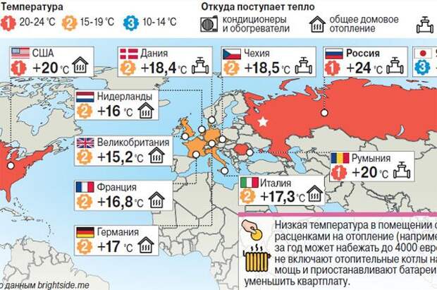 Низкая температура в помещении обусловлена расценками на отопление (например, в Дании за год может набежать до 4000 евро). Люди не включают отопительные котлы на полную мощь и приостанавливают батареи, чтобы уменьшить квартплату.