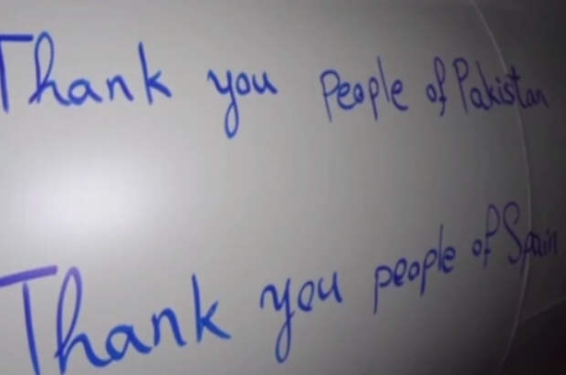 На видео – ракеты, на которых написано: «Спасибо, люди Испании. Спасибо, люди Германии. Спасибо, люди Пакистана. Спасибо, люди Индии».