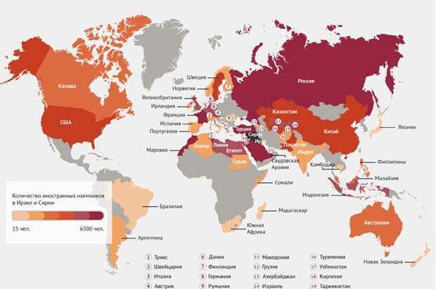 В инфографике АиФ.ru представлены данные об актуальной численности состава террористов, доле иностранных граждан в этих формированиях, а также указаны государства, из которых люди едут воевать за ИГ*.
