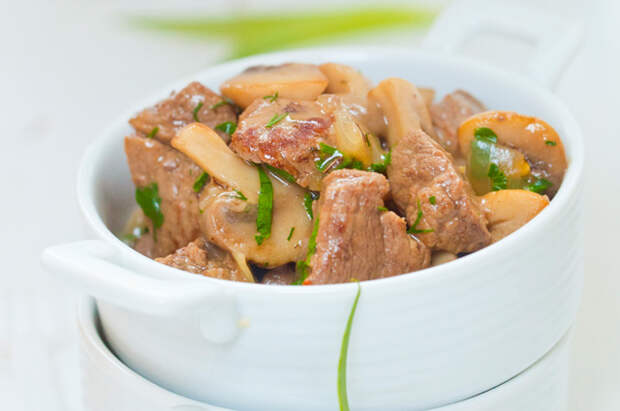 Установите режим «Выпечка» и готовьте в течение 65 минут. Порежьте лук и грибы и добавьте их к мясу за полчаса до окончания режима. Затем оставьте в режиме «Подогрев» ещё на 15 минут.