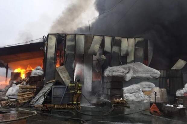 Пожарные в воскресенье ликвидируют возгорание, распространившееся на площади 960 квадратных метров на складе ангарного типа в Новосибирске.